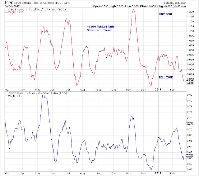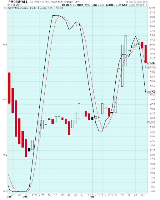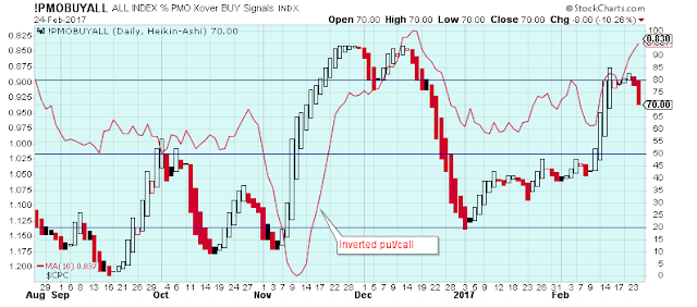 This chart shows the inverted 10-day put/call ratio (so it is now the 10-day call/put ratio) overlay with the general market PMO index. It looks like a reasonable way to help determine short-term highs and lows, and at the moment supports the view that a short-term peak is developing.