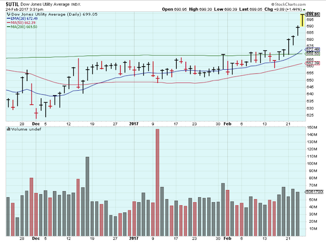 This is such an interesting chart. It shows the XLF:XLU ratio in the top panel, and the 30Y Treasury yield in the bottom panel. I think I got this chart from John Murphy at stockcharts.com.