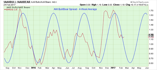 The 4-week average AAII bull/bear spread seems to be on schedule for a March low, but I am not sure the stock market is on the same schedule.