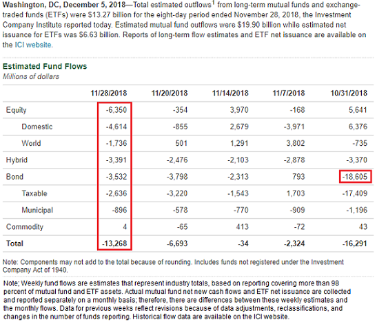 The below chart displays the 1-month rolling sum of ETF and mutual fund flows. For most of the two years shown, domestic equity funds experienced outflows. Until mid year this year, international equity funds were beneficiaries of inflows. The green chart in the bottom pane shows the recent bond outflows. For the most recent week Refinitiv/Lipper Alpha Insights noted fund investors favored money market funds to the tune of +$5.0 billion for the week ending 11/28/2018.