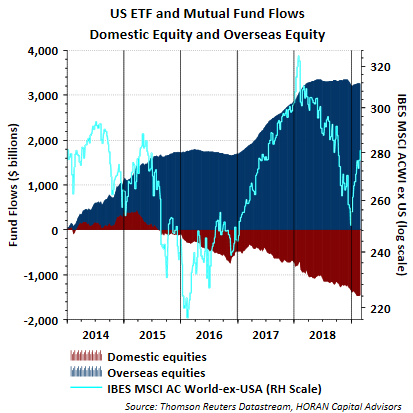 From 2014 to mid-2015, investors seemed to have a favorable view on stocks if one bases the observation on ETF and mutual fund flows. As the below chart shows, the increase in S&P 500 Index until mid-2015 coincided with positive flows into domestic equity focused mutual funds and ETF's. Beginning in mid-2015 though, investor flows turned negative (maroon line.) During late 2016 and early 2017 the cumulative maroon line became less negative indicating positive flows into domestic equities, but the sharp rally from 2017 to the market's peak at the end of the third quarter of 2018 was not supported by positive domestic equity flows. In fact, domestic equity flows have been negative to the tune of -$1.5 trillion over this five plus year period.