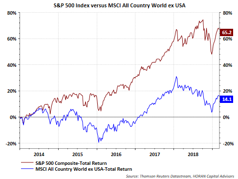 Over the five-plus-year time frame that begins in 2014, the MSCI ACWI ex USA index total return was 14.1% while the S&P 500 Composite was up about 65.2% on a total return basis.