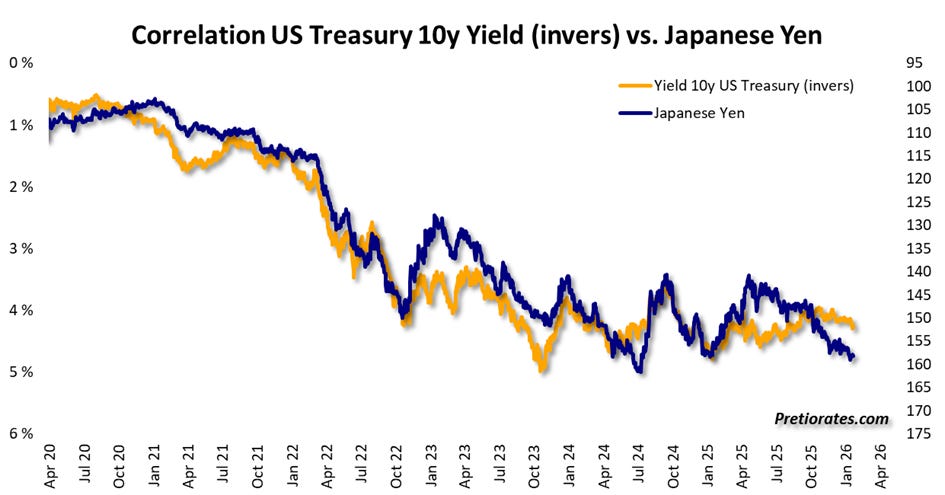 To many, Japan seems like a distant island somewhere in the Pacific. In global finance, however, the Land of the Rising Sun is a heavyweight. Over the past 30 years, yen carry trades have been used to take out enormous loans in yen at extremely favorable terms in order to park this capital in US Treasuries or stocks, among other things, with higher yields. And since we are not talking about a few billions, but trillions of US dollars, it is hardly surprising that US market yields and the Japanese yen have a very close relationship.
