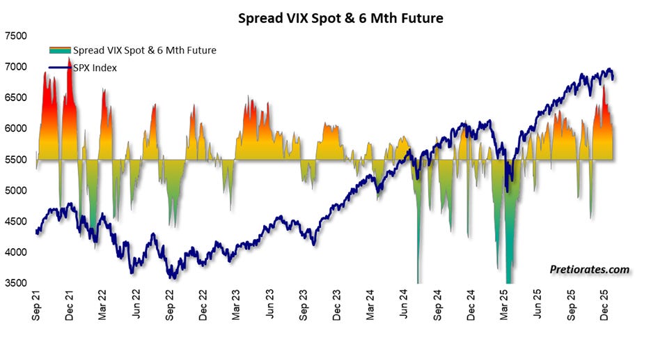 In the end, it is almost secondary whether the Japanese bond market, Greenland, or SCOTUS with its tariff decision is responsible for the increased nervousness. The market itself is already clearly signaling that it is no longer entirely satisfied. Whenever the volatility future is trading significantly above the spot price for six months, trouble is brewing. This situation arises when large investors use futures to hedge against rising volatility – i.e., nervousness.