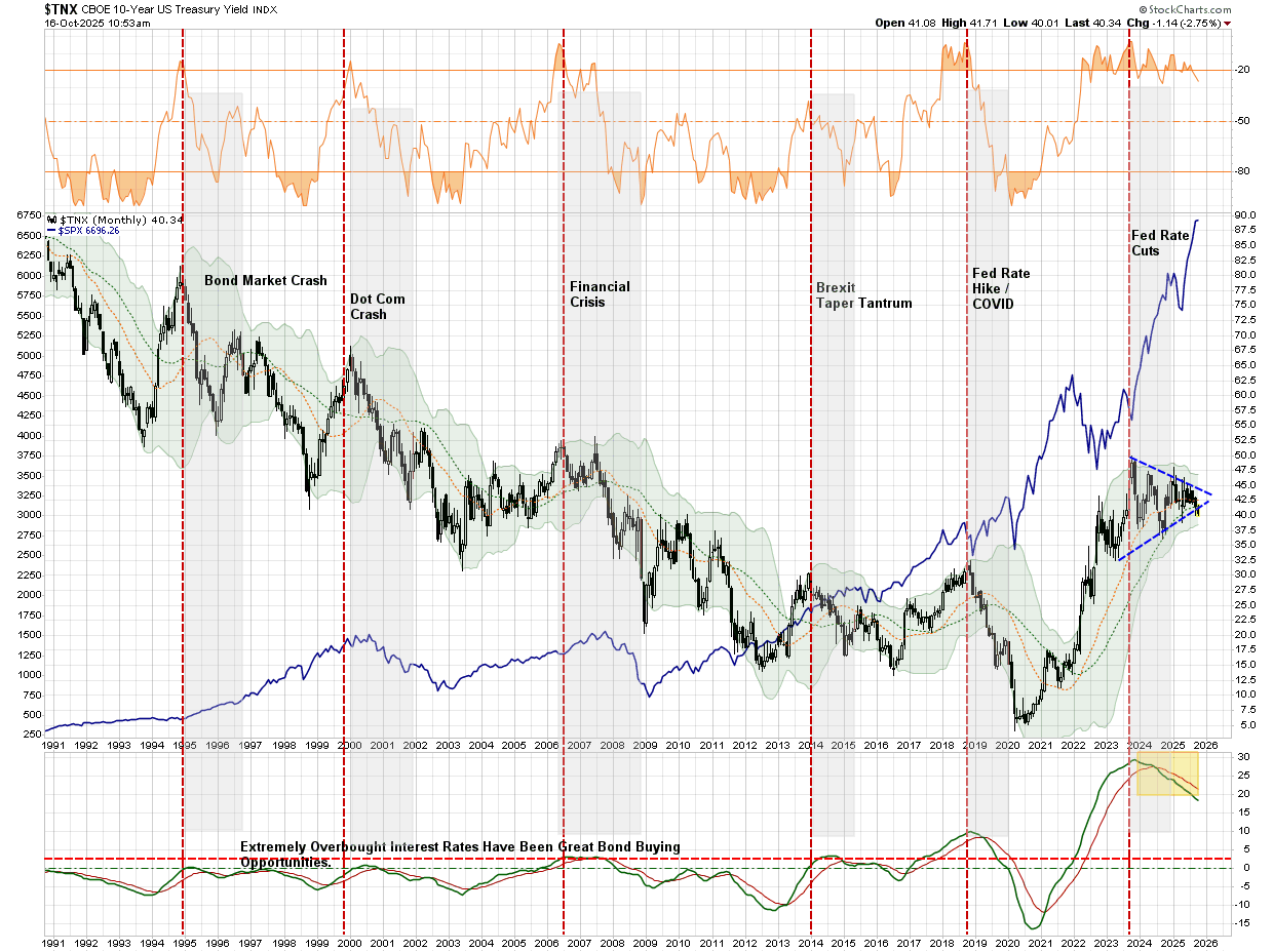 However, the one chart we look closely at is the long-term chart of interest rates. Interest rates have been topping since the beginning of last year and have recently broken below the wedge pattern that has been building. This has two important implications.