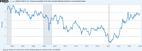Answer: a lot. There is a delicate interplay between gold and bond yields, as investors perpetually re-define what constitutes the ideal safe harbor. In general, rising yields put a damper on gold. Yet the gold bull has continued onward, in defiance of the long bond—especially since 2022, as the yield has climbed by three full basis points while gold skied from under $2000/oz. to near $5000 today.
