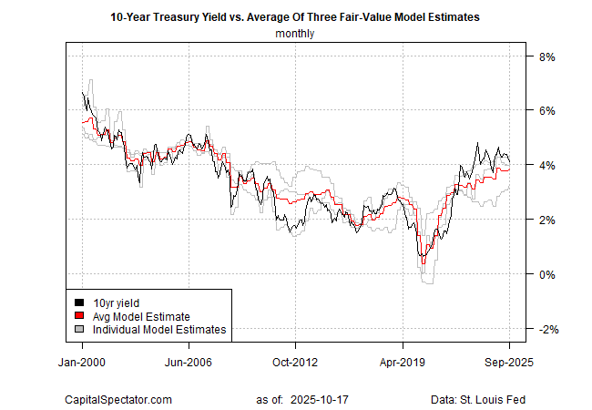 The spread for the US 10-year Treasury yield over a “fair value” estimate has narrowed to the smallest gap in a year, based on the average estimate for three models run by CapitalSpectator.com.