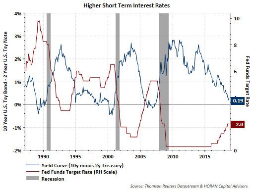 The comments from Fed Chairman Powell following the Jackson Hole meeting this week seem to indicate the Fed will raise rates in September and possibly again before year end, i.e., two more rate increases in 2018. The Fed has a history of increasing the target Fed Funds rate by 25 basis points or .25% when rate hikes are instituted. As of today, the curve is close to inverting and the rate hike probability for September is over 90%.