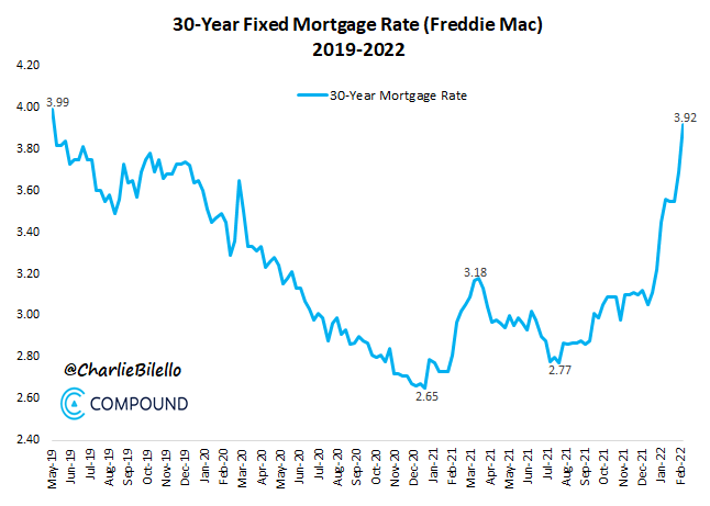 But this is all set to end in March (QE over, first rate hike), and the markets are quickly adjusting to that new reality. The 30-Year Mortgage rate in the US has moved up to 3.92%, its highest level since May 2019.