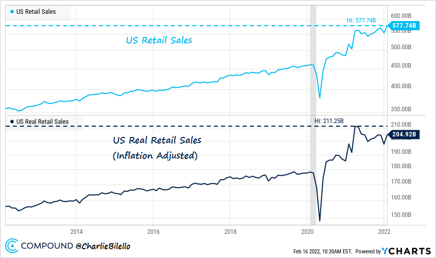 Here’s an interesting juxtaposition: US Retail Sales hit a new high in January while Consumer Sentiment is at its lowest level in over a decade. What’s going on?