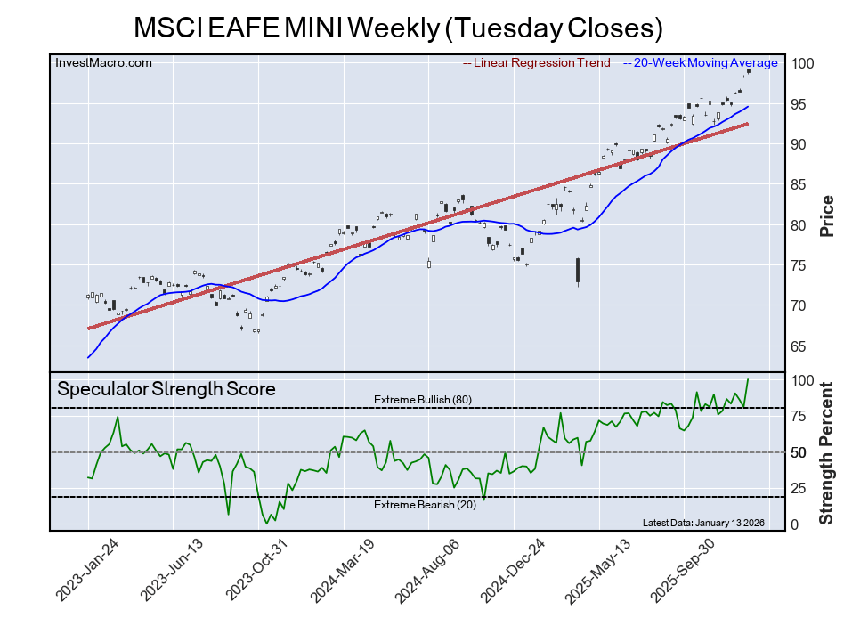The MSCI EAFE MINI speculator position comes in also tied this week in the extreme standings with a current 100 percent score of its 3-year range.