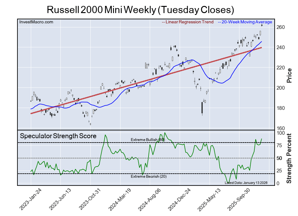 The Russell 2000 Mini speculator position rounds out the top five in this week’s bullish extreme standings. The Russell-Mini speculator level sits at an 88 percent score of its 3-year range with a six-week change in the strength score by a strong 33 percentage points.