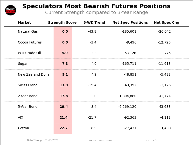 Speculator Extremes: Sugar, VIX, 5-Yr Bond & WTI Crude Lead Bearish Positions