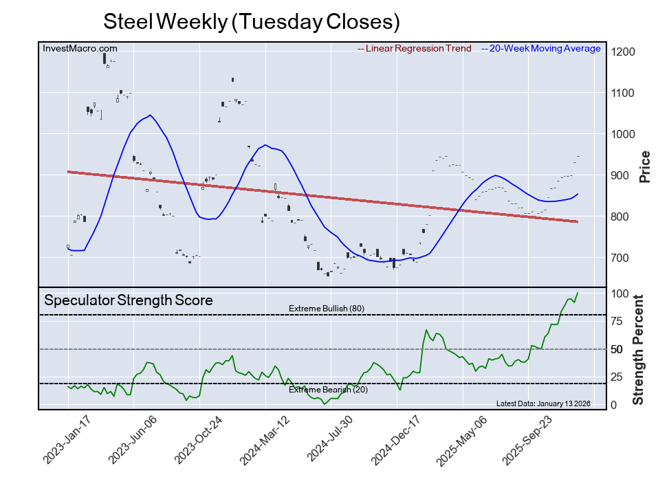 The Steel speculator position comes in tied as the most bullish extreme standing this week. The Steel speculator level is currently at a 100 percent score of its 3-year range.