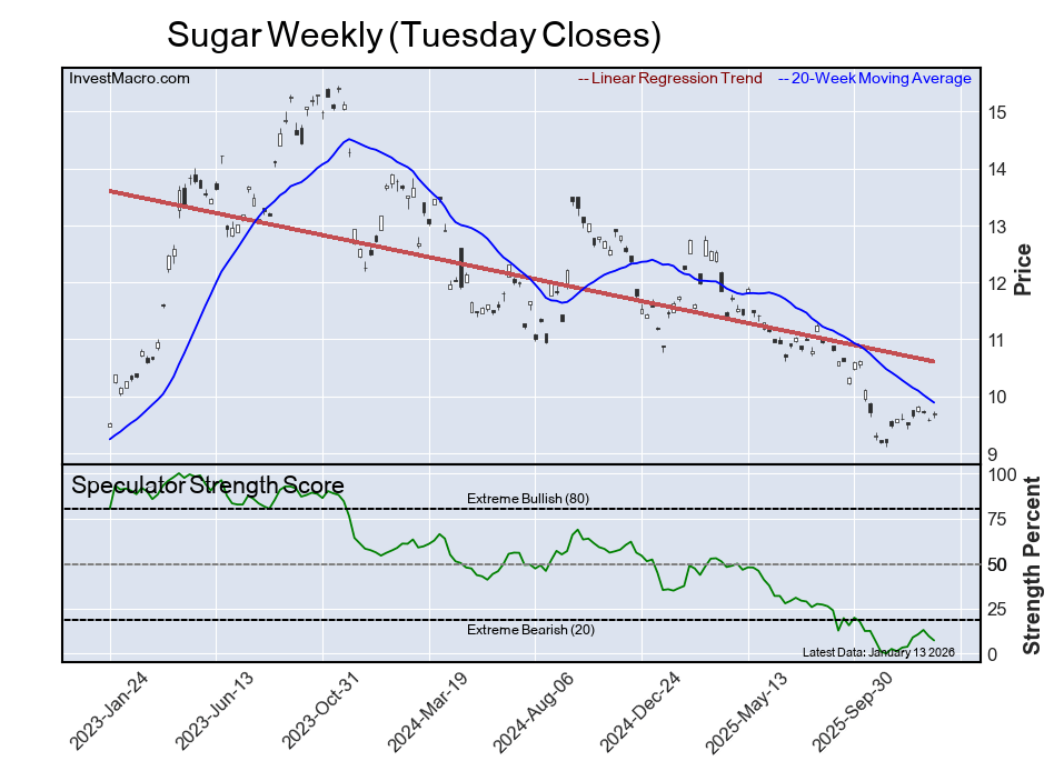 The Sugar speculator position comes in as this week’s fourth most bearish extreme standing with the Sugar speculator level at a 7 percent score of its 3-year range.