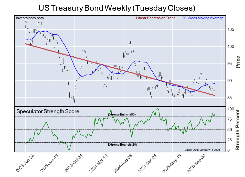 The US Treasury Bond speculator position comes up number four in the extreme standings this week with the Long T-Bond speculator level at an 88 percent score of its 3-year range.