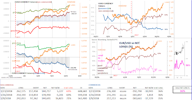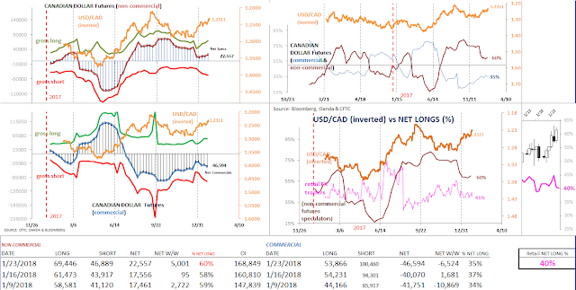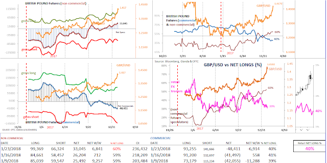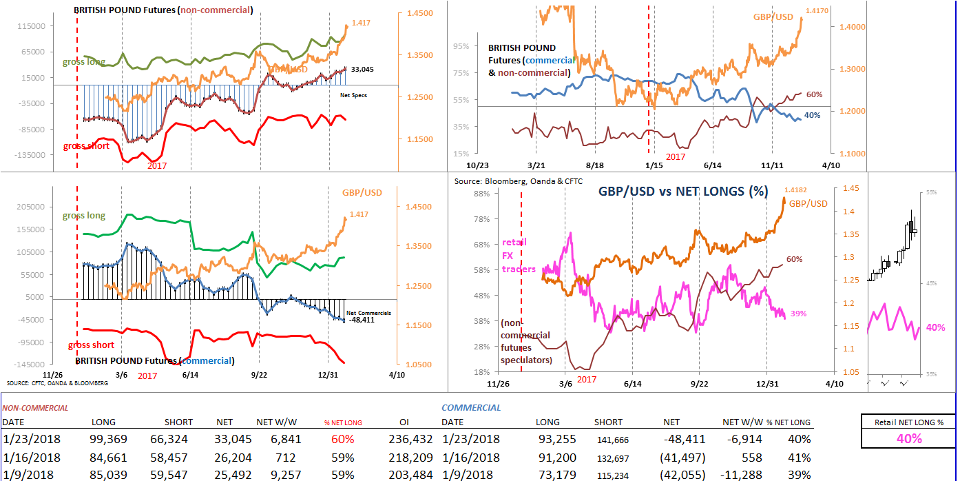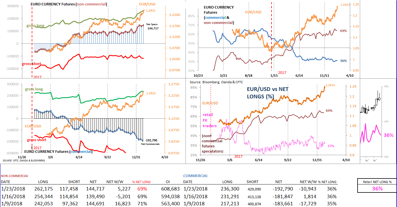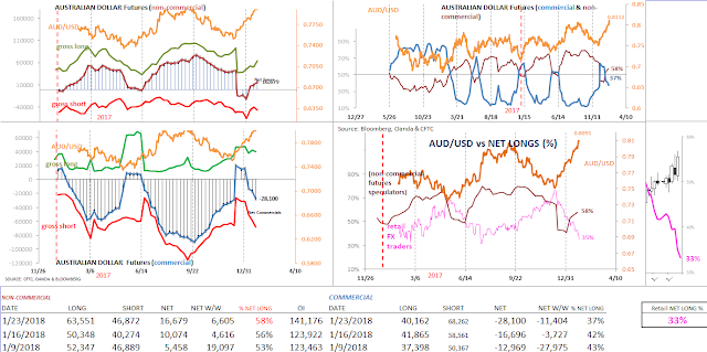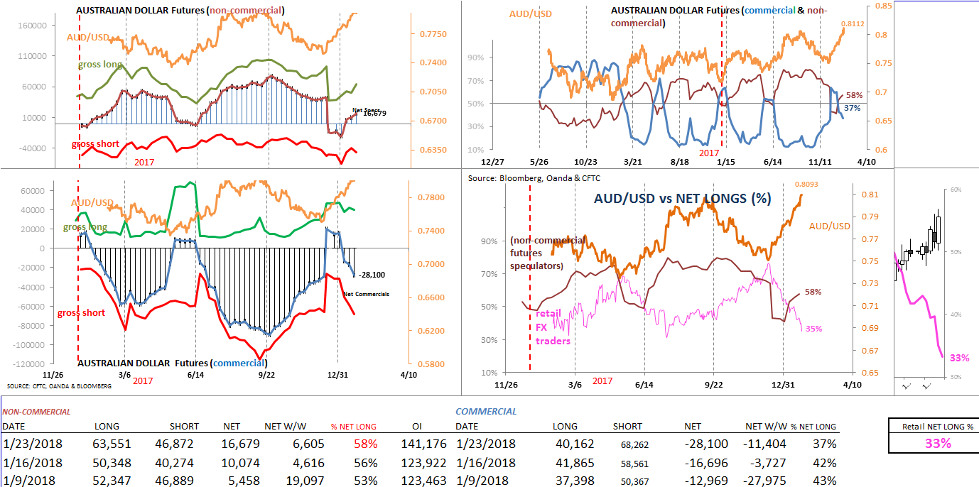 Speculative sentiment in Australian dollar (futures) has made a nice come-back recently. After seeing a rather sharp adjustment in (net long) positioning heading into the year-end (2017), bullish sentiment for large traders has improved the first three weeks of the new year. The Aussie, meanwhile has enjoyed more than 7 weeks of uninterrupted gains, with a large part due to broad based dollar weakness.