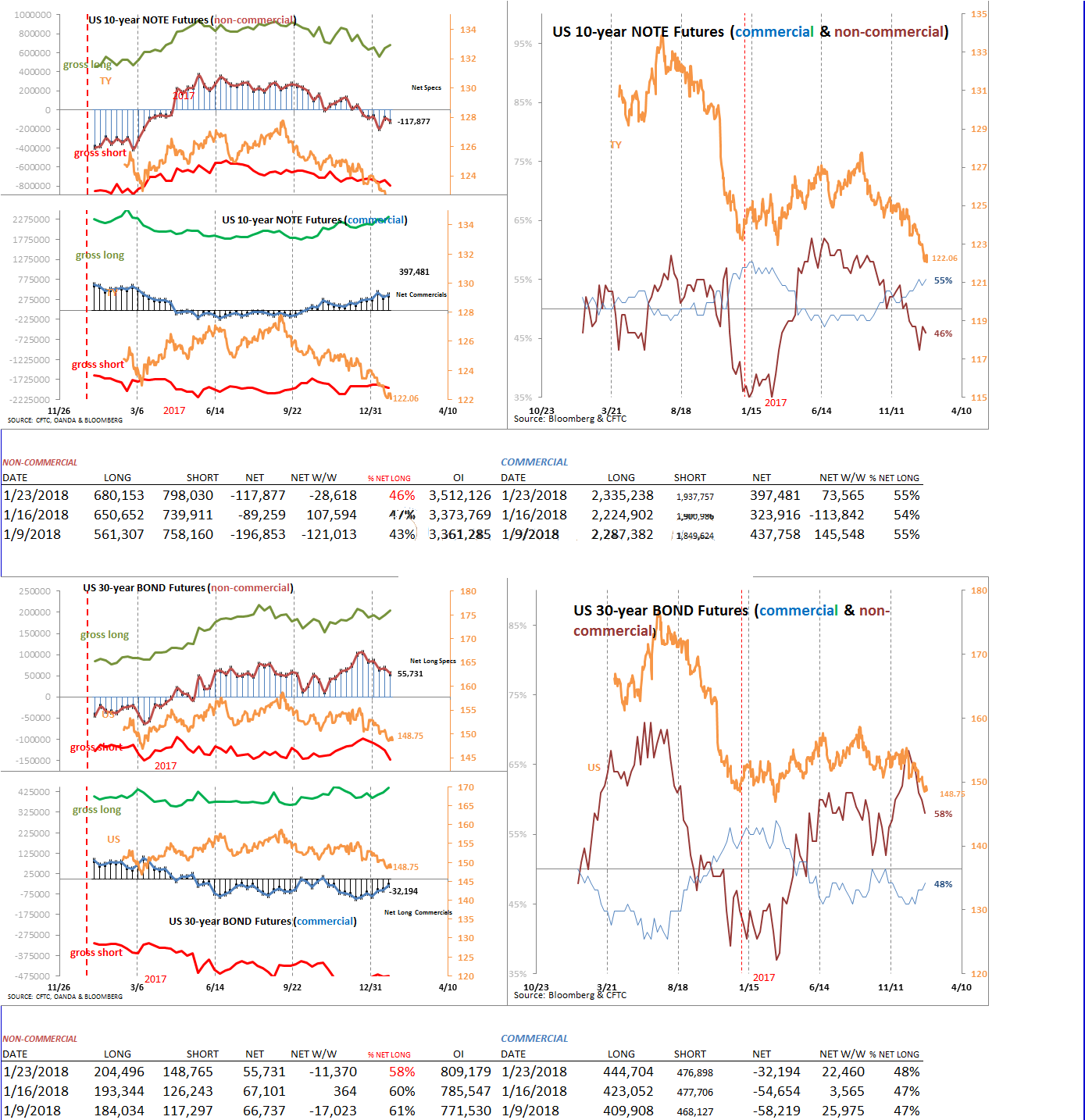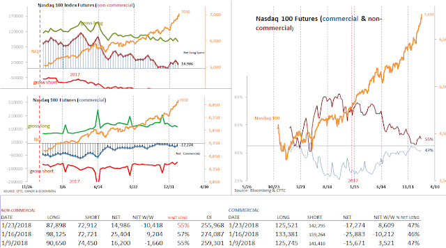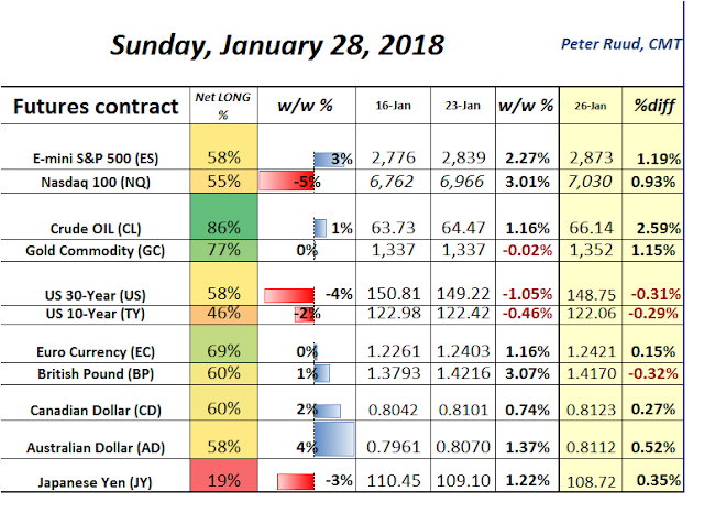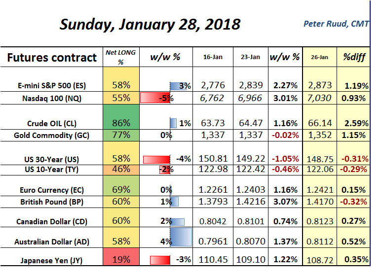E-mini S&P 500 futures continue to mark fresh all-time highs despite extremely (weekly) overbought conditions. In the latest COT report, futures speculators significantly added long positions, allowing for the net long percentage to jump to 58% from 56%. Price-action in S&P 500 futures, has accelerated since breaking-out of the mild correction that took place in the final weeks of 2017.
