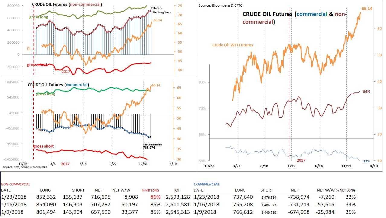 Crude oil futures speculative sentiment remains near extremes, as positioning by futures traders (into January 23rd) inched up to 86%. The net long position (total) also continues to hover near record highs, as the short covering trend has continued as of late. Meanwhile, Crude oil prices have thrusted to fresh cycle highs after briefly consolidating near the 64 handle, putting the 70 handle within reach in the near-term. At this juncture, only a clean break below the 65 handle would trigger a brief correction of the extreme (long) positioning by speculators and potentially re-open the 62.80 region to the downside.