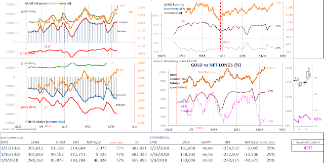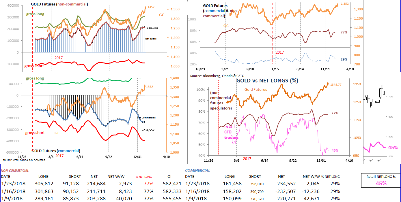 Gold futures (bullish) sentiment continues to improve since early-December's modest correction. According to the latest COT report, the number of (gross) long contracts increased slightly, but was mostly tempered by a modest bump in gross short contracts. As a result, net longs remained at 77% (as of January 23rd) for the 3rd straight week. Meanwhile, Gold futures have continued to rally on the back of a weaker dollar advancing for the 6th week over the past 7 weeks. The rally in gold futures has taken place coincidentally as the retail population has continued to sell the yellow metal uninterruptedly in the same time span.