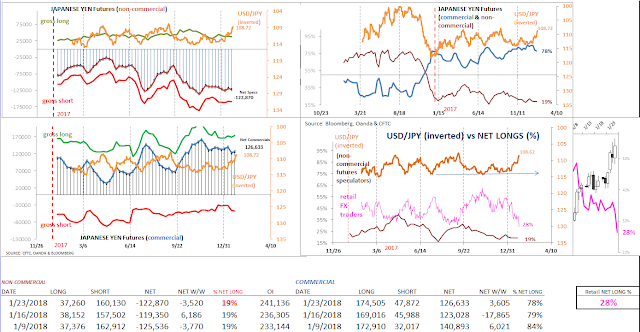 Meanwhile, the retail population which had been selling JPY since the start of 2018, accelerated their bearishness last week to reach a new low in yen optimism. This suggests that there's plenty of room for speculators to buy, given less than 20% of the total (non-commercial) contracts outstanding are long.