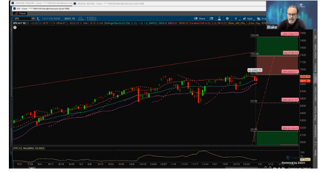 The S&P 500 started the year with a gap up and a close down. The monkey bars show the recent price action sitting between fair price levels and overbought territory.
