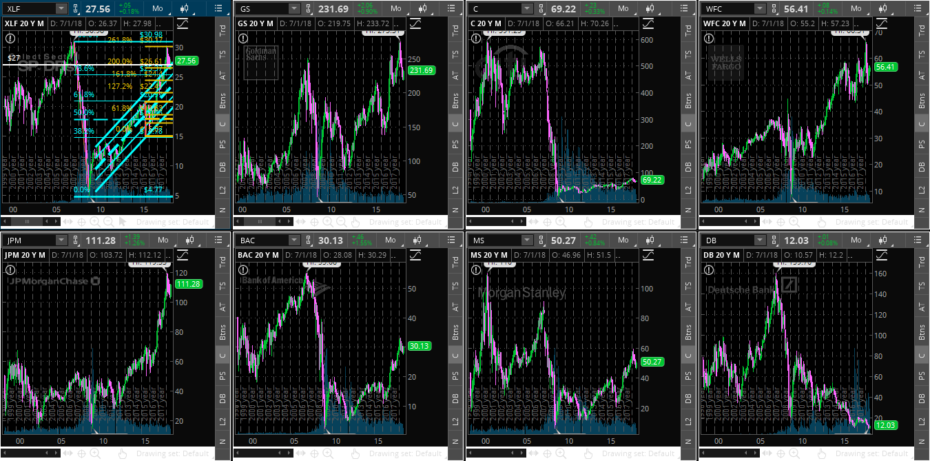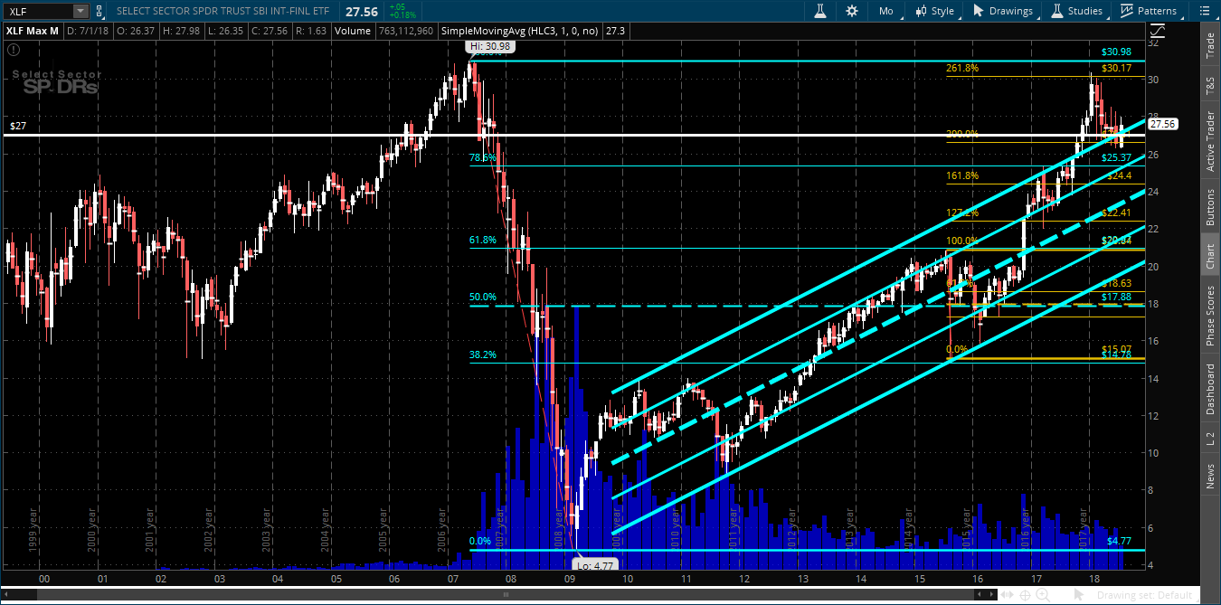 At the moment, the Financials ETF (XLF) is hovering just above major support at 27.00, as shown on the following monthly chart, and the banks stocks are stuck in their respective consolidation zones, as shown on the last monthly chartgrid.