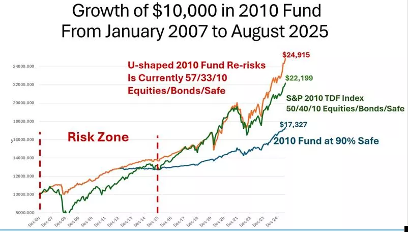 This is an important result because $4 trillion is invested in TDFs that have not evolved so those near retirement now are in jeopardy, but they would not be if they were in a U-shaped glidepath. TDFs need innovating.