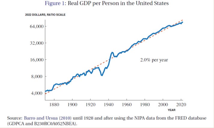 This so-called classical dichotomy gets us two of the three types of macroeconomics. We can explain nominal variables by looking at the market for money, the supply and demand for money, and we can explain real variables in the long run with a wide range of other factors. Real GDP depends on the working age population, the capital stock, natural resources, technology, and all sorts of institutional factors that influence how effectively the factors of production are used. For several hundred years, real output in the US has trended upward at roughly 3%/year, with some variation (it’s a bit slower now, due to slower population growth.) A post by Timothy Taylor shows a per capita growth rate of about 2%:
