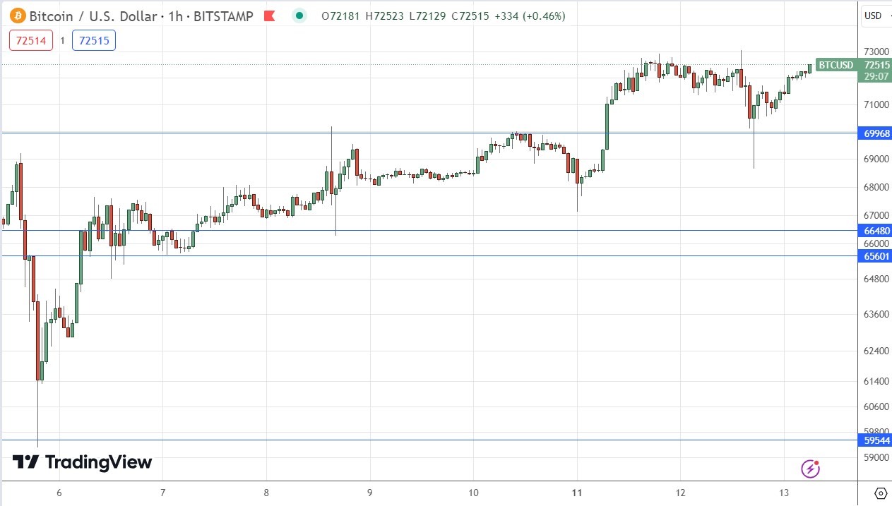I am happy to hold a long position and I think it is wisest to look for long trades. Two consecutive higher hourly closes above the all-time high of $73,054 could be a good entry signal.