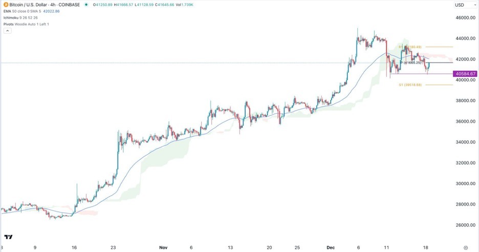 Bitcoin has also moved below the Ichimoku cloud. Also, the pair has retested the Woodie pivot point. Fortunately, it has formed a small double-bottom pattern at 40,585 whose neckline is at 43,245, which is also along the first resistance of the Woodie pivot point.