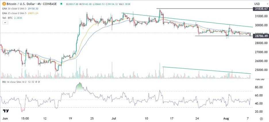 The BTC/USD pair has moved below the descending trendline that connects the highest point on July 3rd, July 23rd, and August 2nd. Bitcoin has also found a strong support level at $28,786, where it failed to move below since July 24th.
