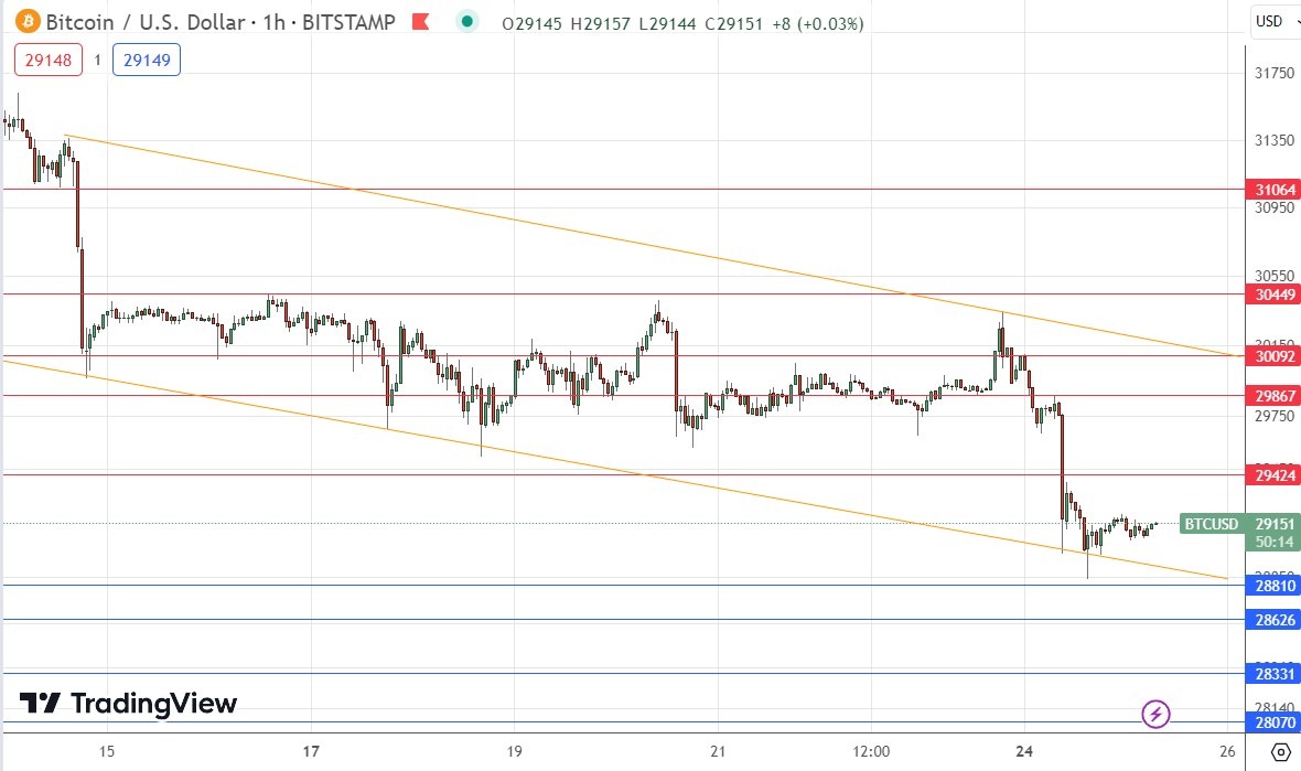 This was a good call over the medium term as although none of the key levels were reached that day, the price has continued to descend, get below $29,424, and continue descending within the expanding bearish price channel.