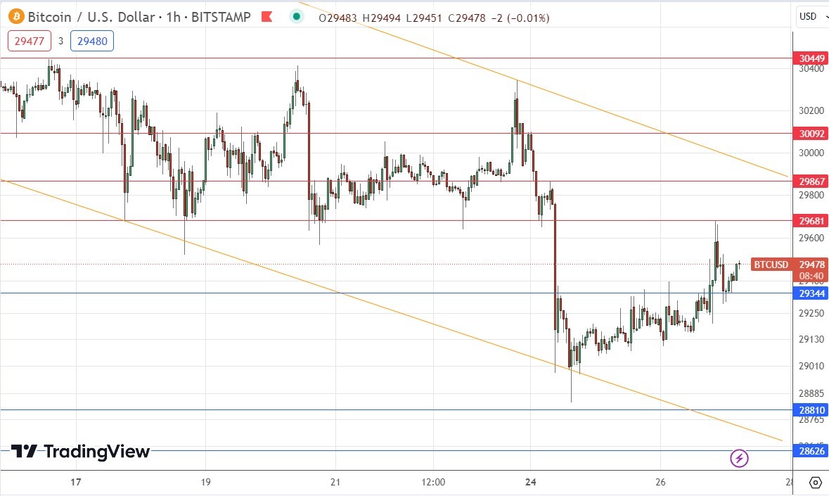 I wrote in my previous BTC/USD analysis on Tuesday that after the price made a small head and shoulders pattern which seems to have made a short-term bullish rejection of the round number at $29k as support, there might be a chance for a long scalp despite the price being well-established within a longer-term descending price channel.