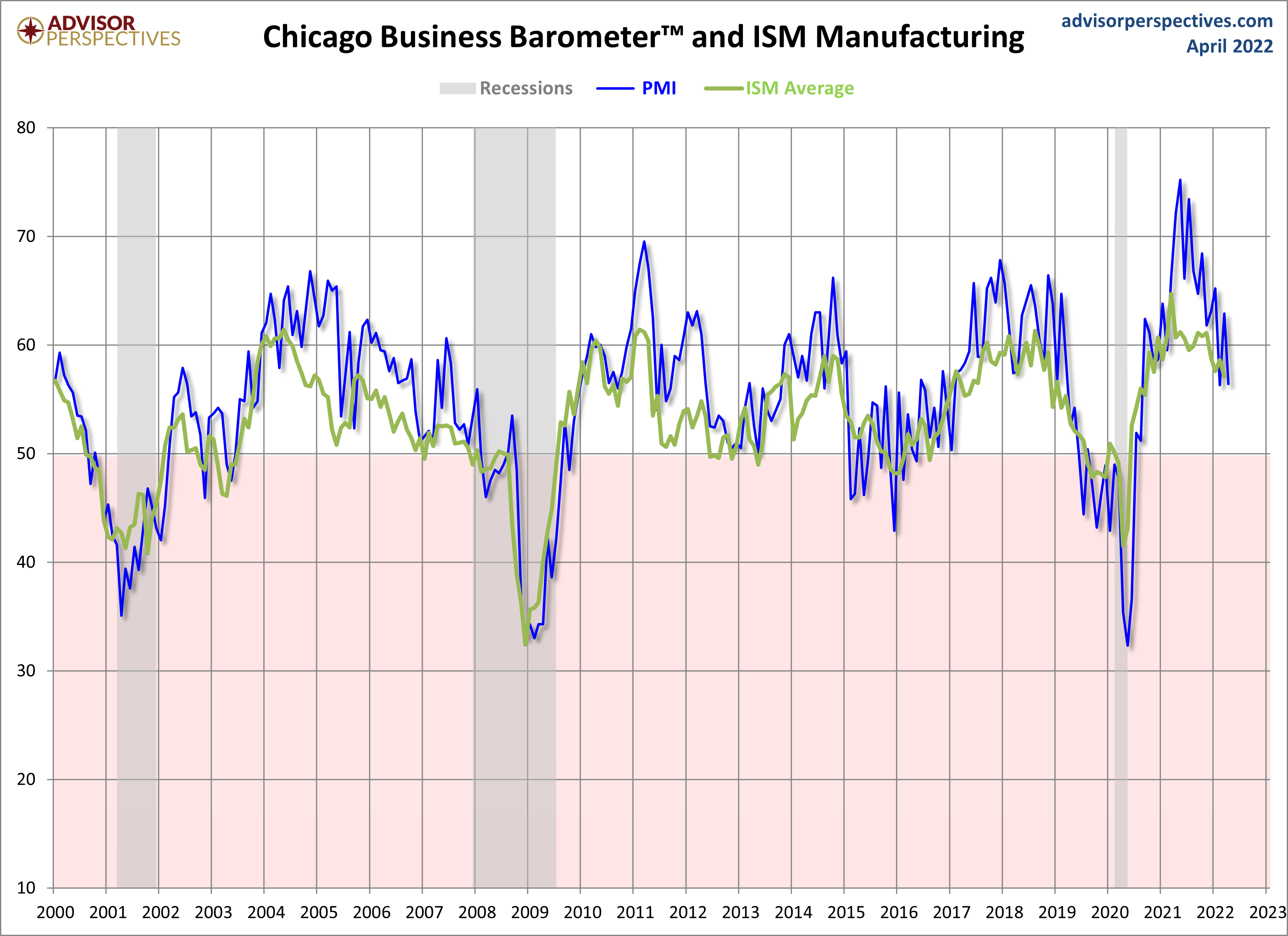 Let's compare the Chicago PMI with the more popular national ISM Manufacturing Index. Both indices clearly follow one another, with the ISM falling slightly lower on average. Note the ISM Manufacturing indicator is through the previous month.
