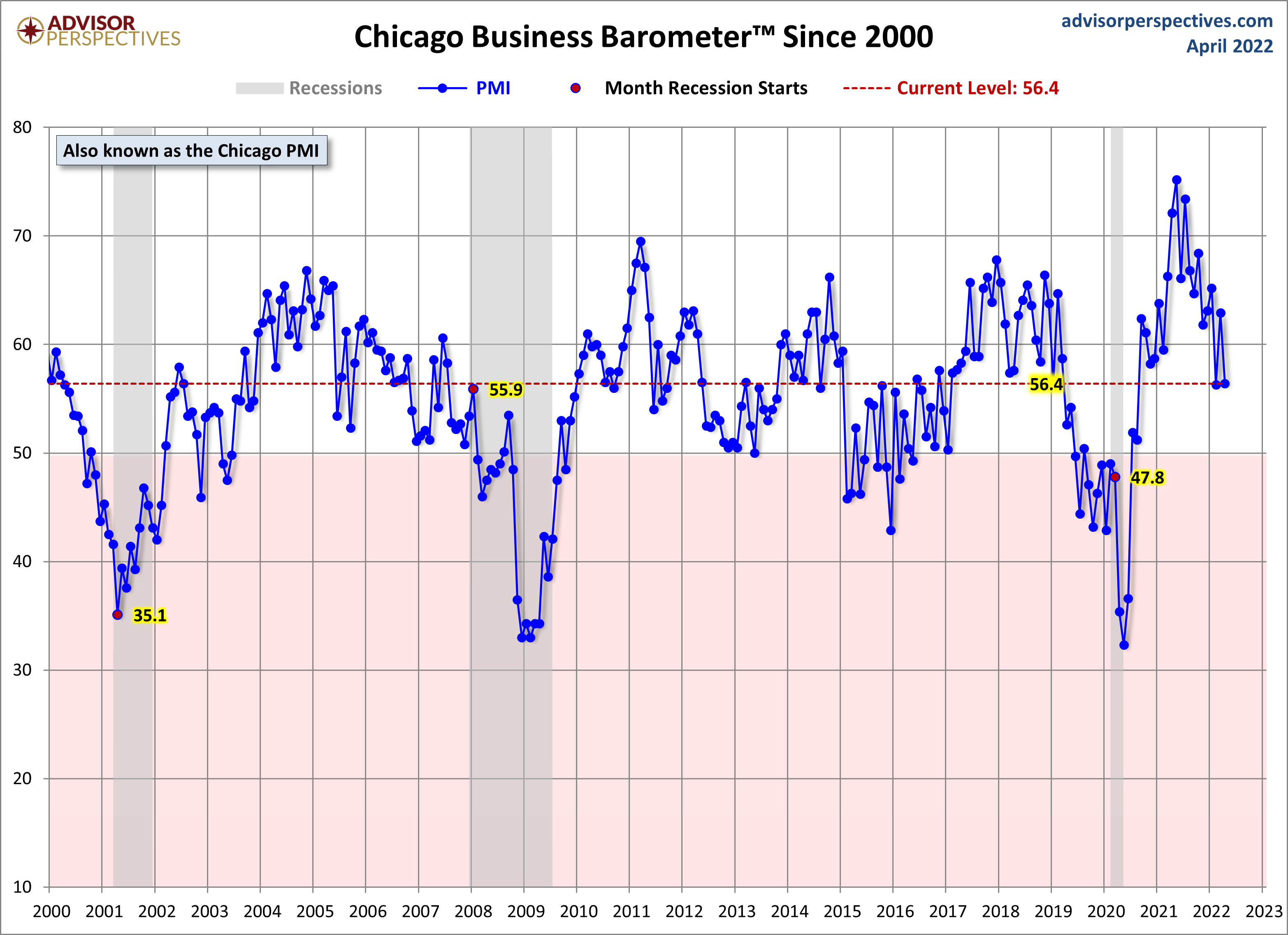 The latest Chicago Purchasing Manager's Index, or the Chicago Business Barometer, fell to 56.4 in April from 62.9 in March, which is still in expansion territory. Values above 50.0 indicate expanding manufacturing activity.