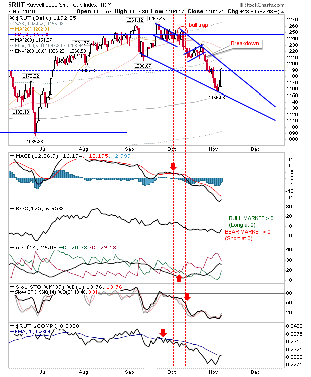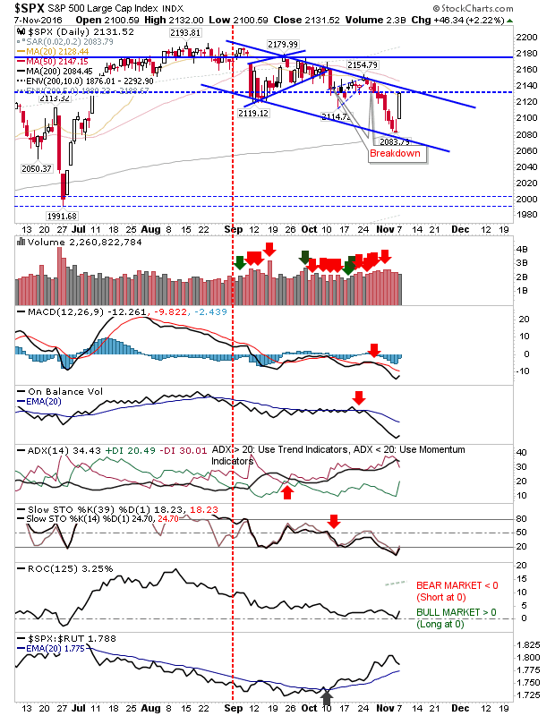 There may be some additional gains tomorrow, but watch for stall outs at wedge/channel resistance.  Another day like today is possible, but with buyers showing their hand early, any muddled concession (or Trump victory) could trigger indecision and fresh (hard) selling.