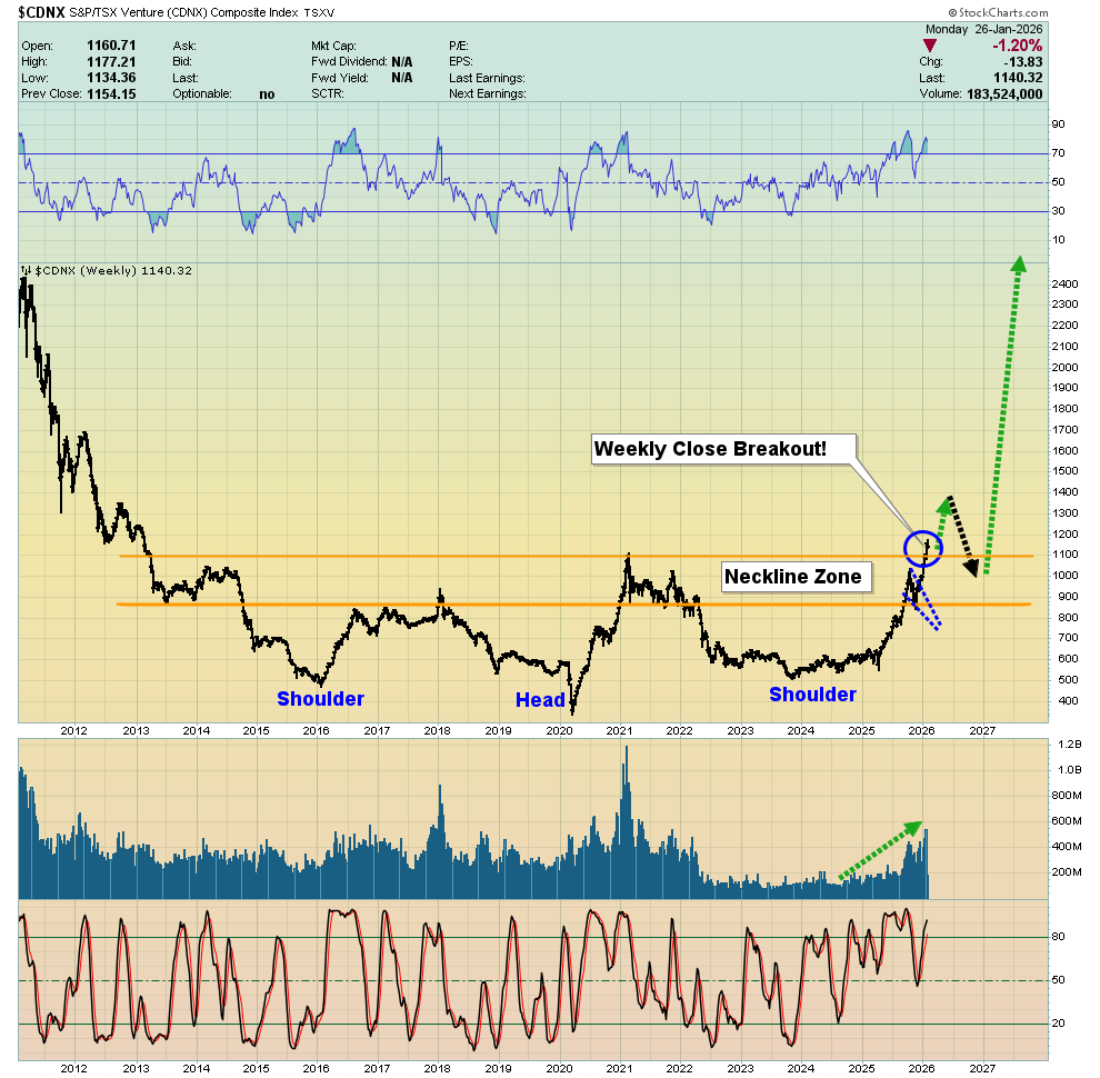 While intermediate and senior miners have failed to outperform gold and silver, a myriad of CDNX and OTC-listed juniors are staging glorious ten, twenty, and even one hundred bagger action… with more to come! A pullback after this kind of breakout is expected and normal. Note that the neckline is the entire 1100-850 zone.