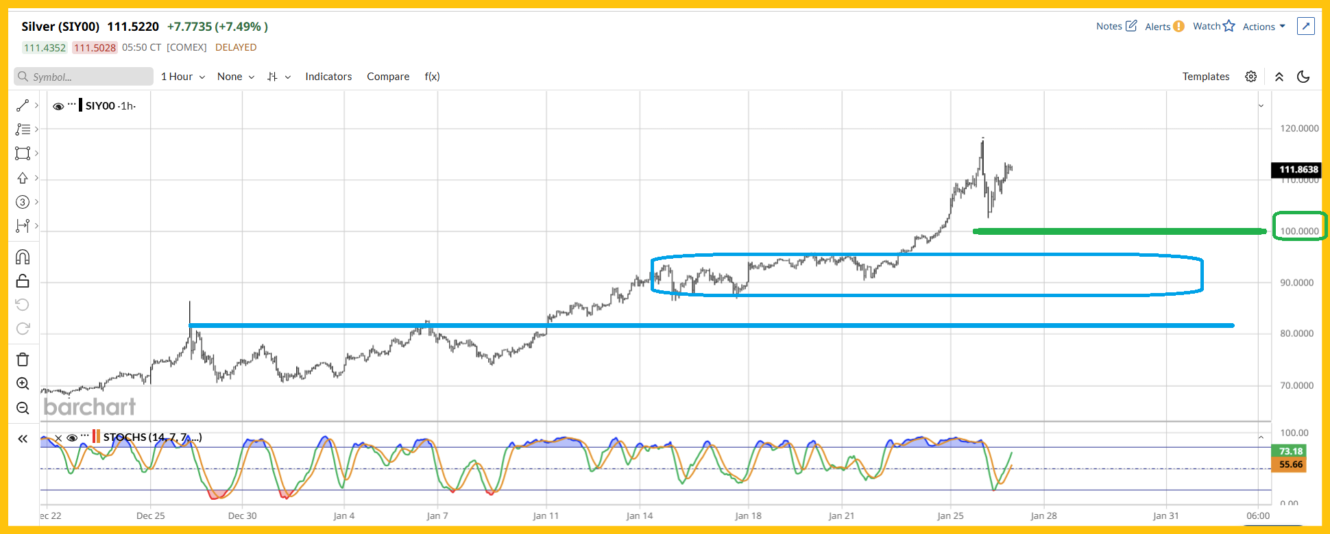 The big round number of $100 has been cleared, and there are numerous floors of support just under that price. There is no need to call a metals market “top”, but there is a need for investors to book some profits and be prepared to buy the next significant sale in the price… a sale that may not begin until silver is above $120.