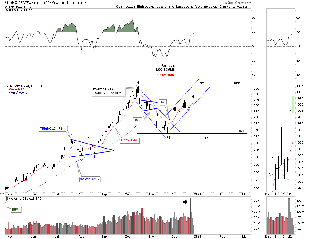 After trading sideways for three weeks at the center dashed midline of the October trading range, CDNX is moving back up towards the top of the trading range, where we can begin to look for a possible 3rd reversal point to the downside.
