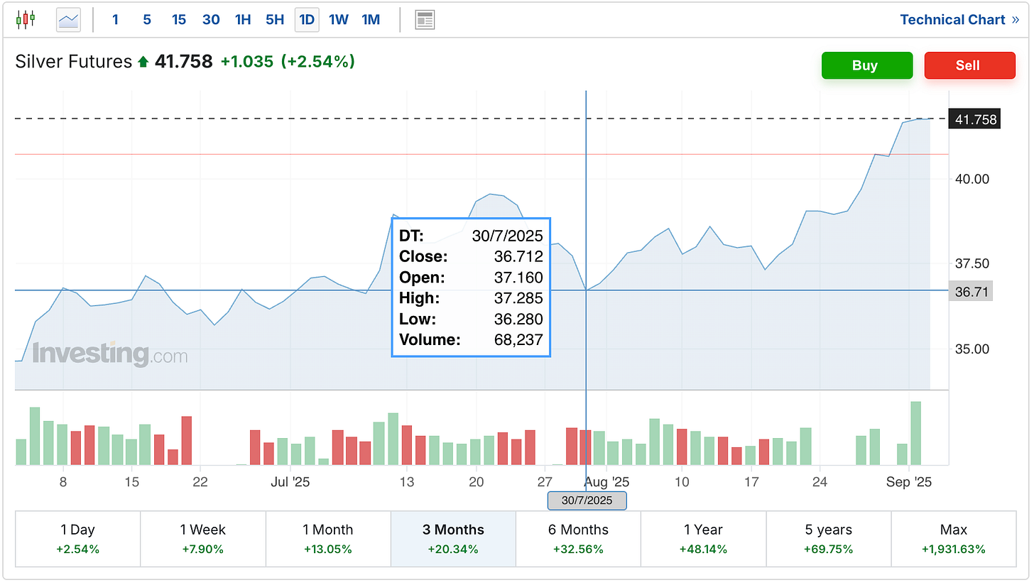 It also feels like we're quite a ways away from the silver sell-off at the end of July that left the price as low as $36.28, not all that long after the futures had come within 9 cents of breaking the $40 level a few weeks earlier.