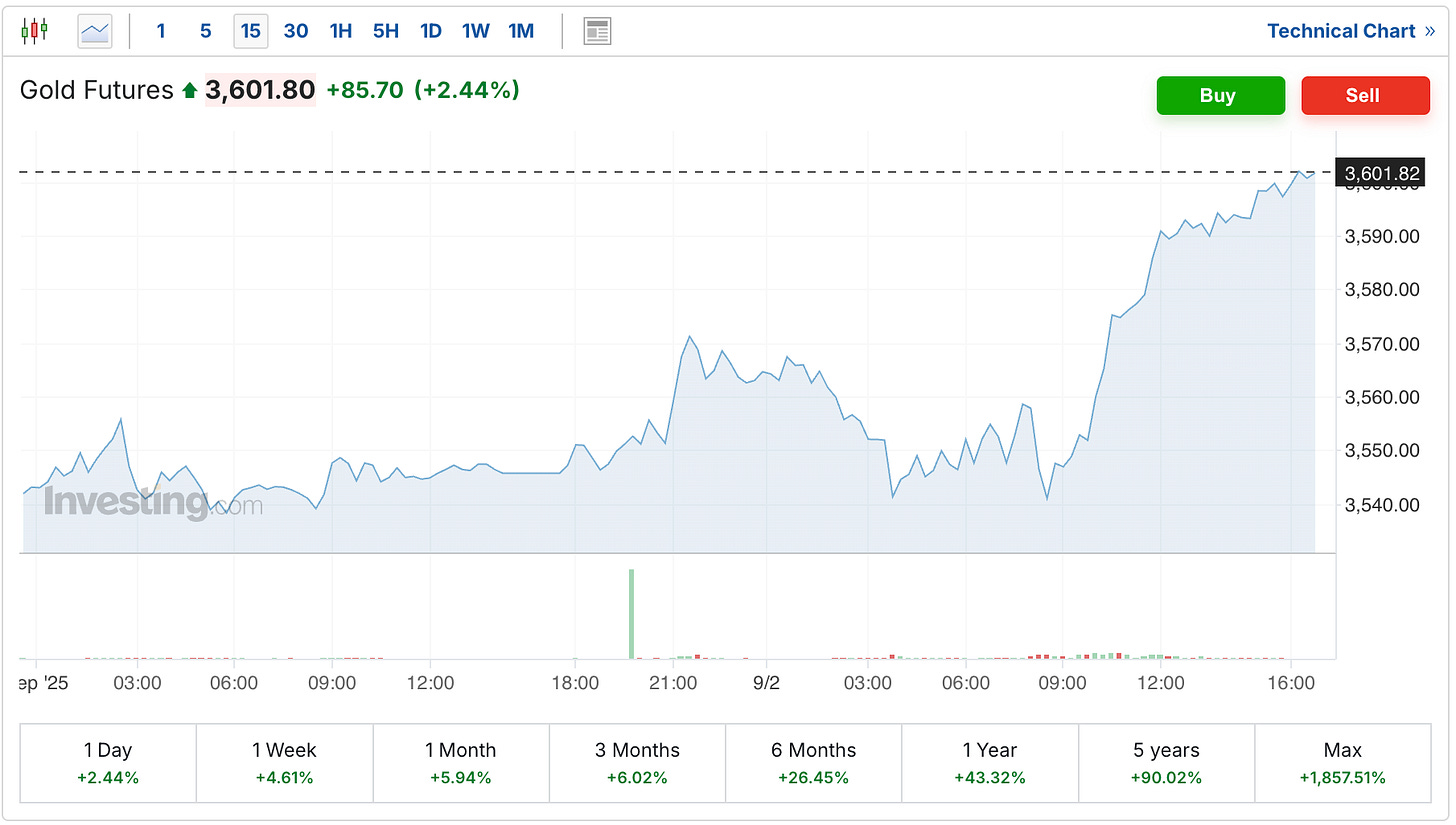 Although not to be outdone, the gold futures had a huge day on Tuesday as well, rising by $86 to cross over the $3,600 level, another new all-time record high for gold.