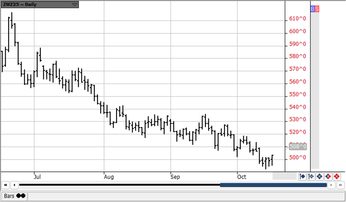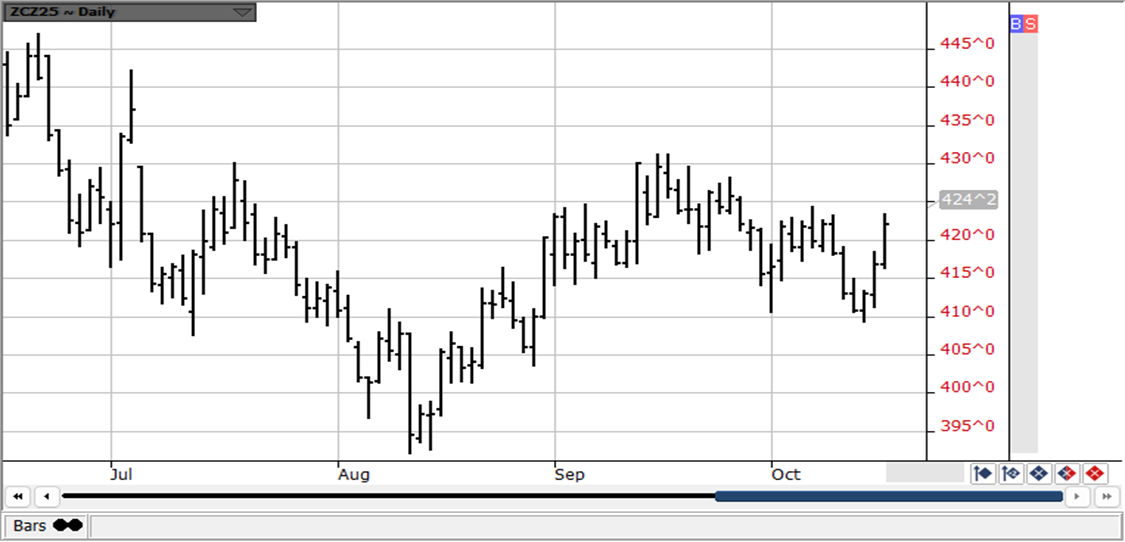 A plethora of positive fundamentals has lifted Dec Corn to its Oct highs -including passing the half-way point of harvest, declining yield reports due to dryness & disease, indications from Chairman Powell that interest rates could go down significantly, statements from the Treasury Secretary that Presidents Trump & Xi would meet at the end of October & continuing superb exports due to US corn being the cheapest in the world! Monday inspections came out Tuesday & were excellent! The mkt appears to have dialed in the record crop – which has been in the news all Summer!