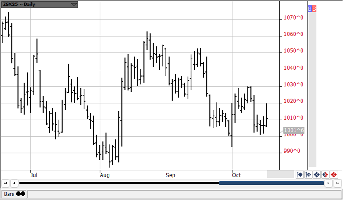 NOPA today announced 11 mb more beans were crushed than expected by analysts & this helped rally Nov Beans to 1020! Also, reports from our Treasury Secretary & Trade representative indicated that President Trump & China President XI would indeed meet at the end of October to discuss a trade deal! As well, bean’s non-China exports have been excellent – with a cheaper US Dollar & with US beans the lowest anywhere globally! Finally harvest is well over 50% in & the mkt has partially discounted the possibility that no US-China deal will be reached in 2025! Plus, $10 beans are historically quite cheap!