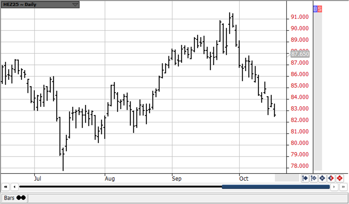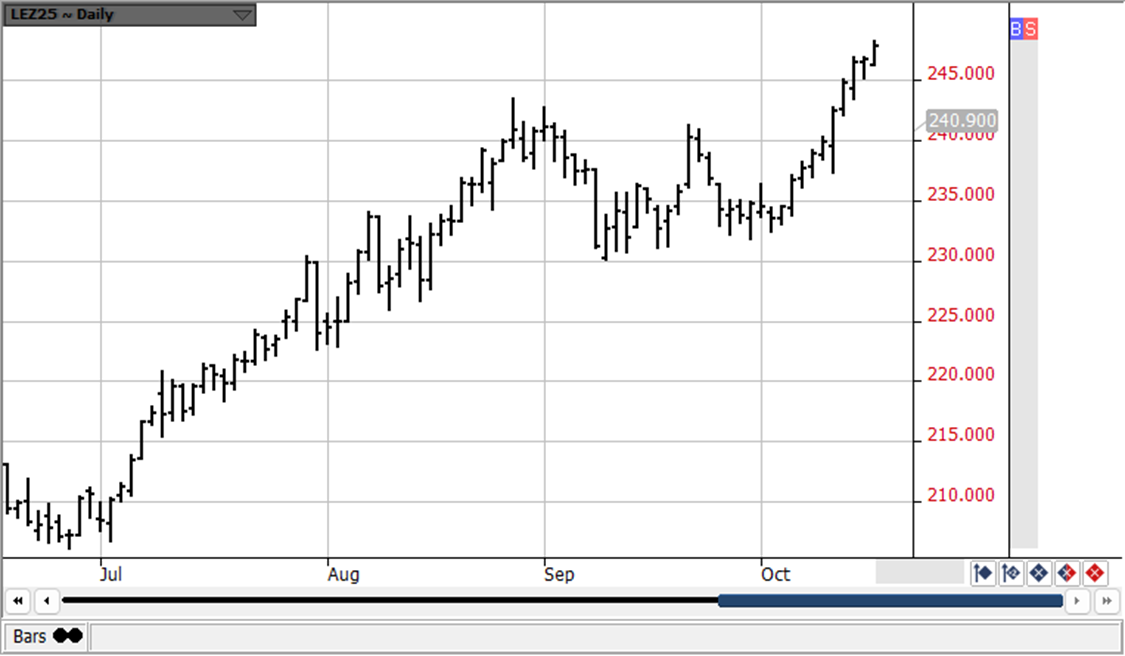 The raging Bull Mkt that is Dec Cat keeps chugging along despite being at record prices even well after the prime summer demand period which normally ends after Labor Day! the mkt has been supported by very low numbers & a closed US-Mexican border due to the ongoing screw-worm issues! Even relatively low pork prices haven’t been enough to lure buyers from the very high priced beef in the supermarket!