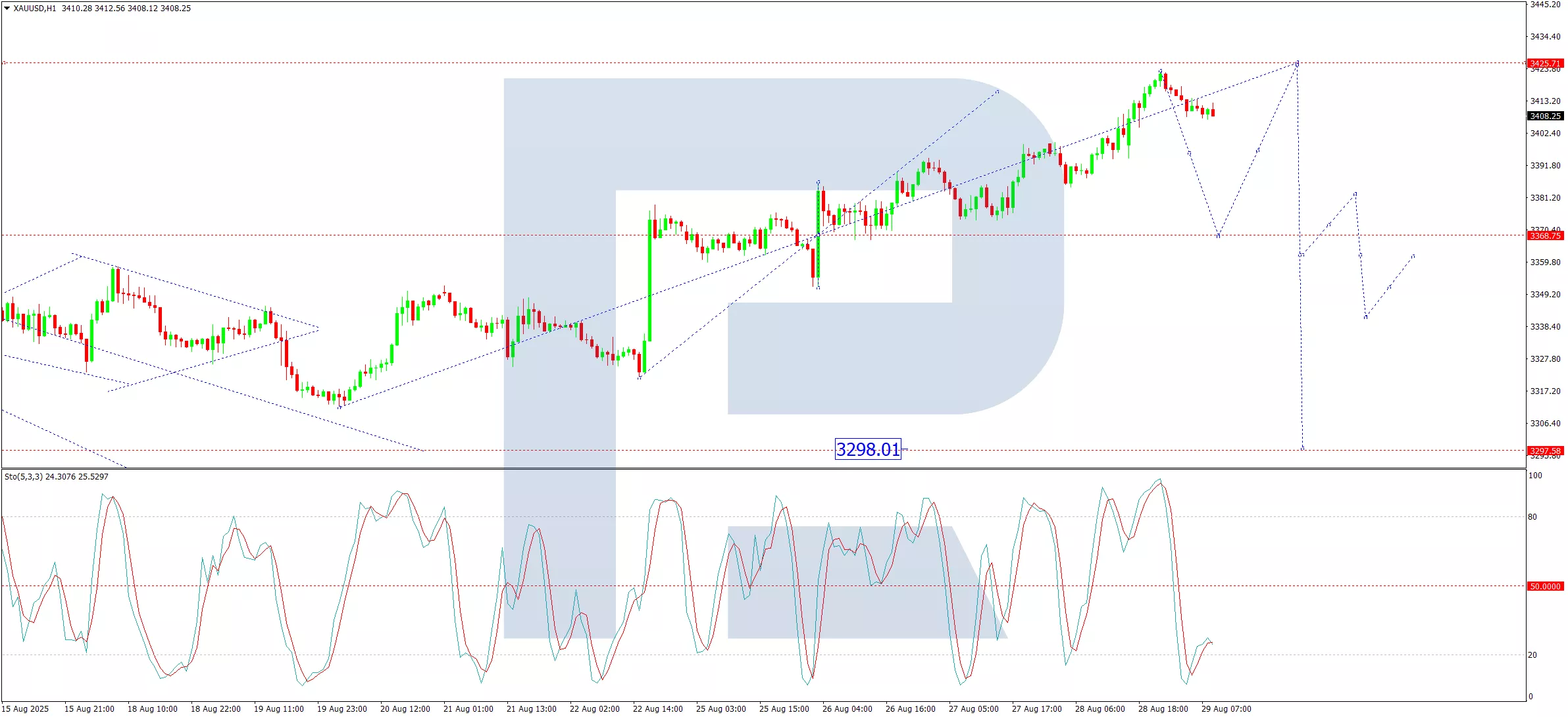 On the H1 chart, XAUUSD formed a consolidation range around 3,368 and broke upwards, completing the third growth wave at 3,420. The market has now started a downward correction towards 3,368. After reaching this level, a compact consolidation range is expected. A downward breakout would confirm continuation of the decline to 3,290, while an upward breakout could produce another growth structure towards at least 3,425. The Stochastic oscillator confirms the bearish correction, with its signal line below 50 and heading strictly towards 20.