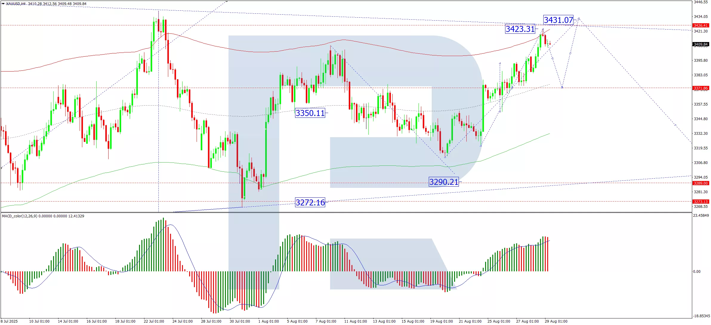 On the H4 timeframe, gold completed a growth wave to 3,423, marking a local target. A decline towards 3,371 is now in play, with the market continuing to develop a wide consolidation range around this level. A downward breakout would open the way to 3,290, while an upward breakout could extend the range to 3,431 before the downtrend resumes towards 3,290. The MACD indicator supports this view: its signal line is above zero at the highs but has left the histogram zone, a sign of potential weakness and the beginning of a move towards new lows.