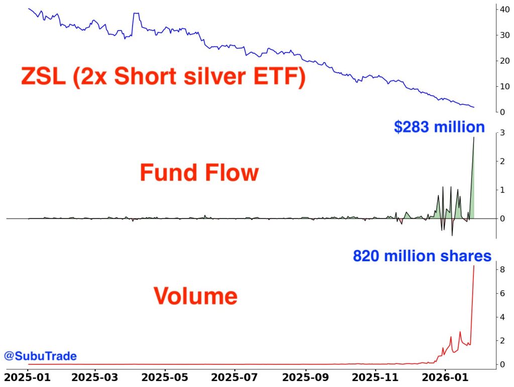 While I don’t expect this to be THE top in silver for this cycle, I am playing for a short term top. The vehicle I’m using is the ProShares 2x Short Silver ETF (ZSL). (My average price from Wednesday is $1.65 while ZSL closed Wednesday at $1.57). Investors have been piling into this ETF in recent days and I don’t think it’s all dumb money.
