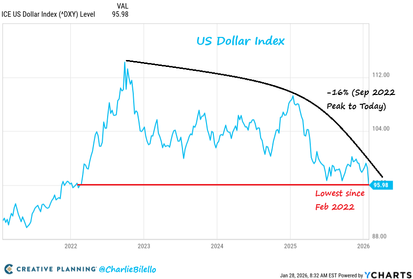 The precious metals – especially silver – have gotten overly extended to the upside while the dollar seems due for a countertrend rally. SLV closed 144% above its 200 day moving average on Wednesday as massive amounts of funds flow into the ETF. The dollar – on the other hand – is the most oversold since 2007 by one measure and at its lowest level since February 2022. To be clear, I am bullish on silver and bearish on the dollar longer term. But in the short term, I’m betting on a countertrend move.