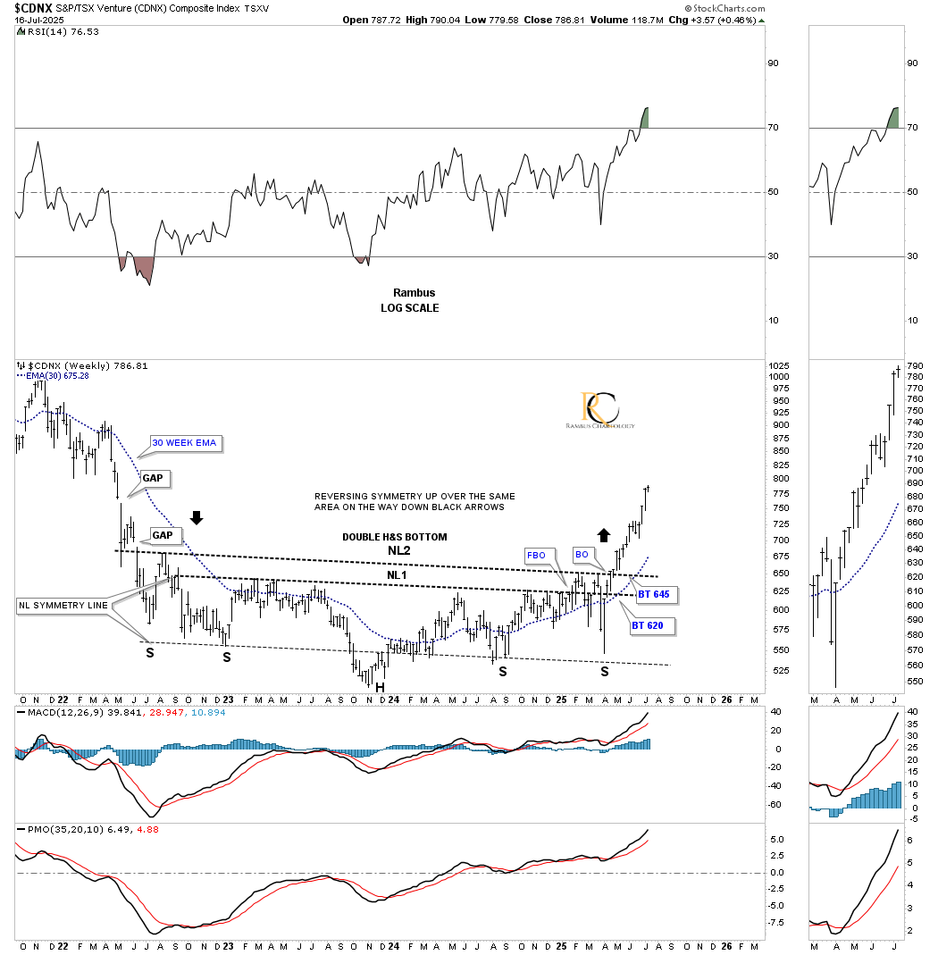 This weekly chart shows the clean version of the double H&S bottom, which is very symmetrical, as shown by the neckline symmetry line, which showed us where to look for a possible low for the right shoulder for both necklines. The reverse symmetry to the upside is still playing out beautifully as shown by the black arrows; how CDNX went down is how it’s going up over the same area.